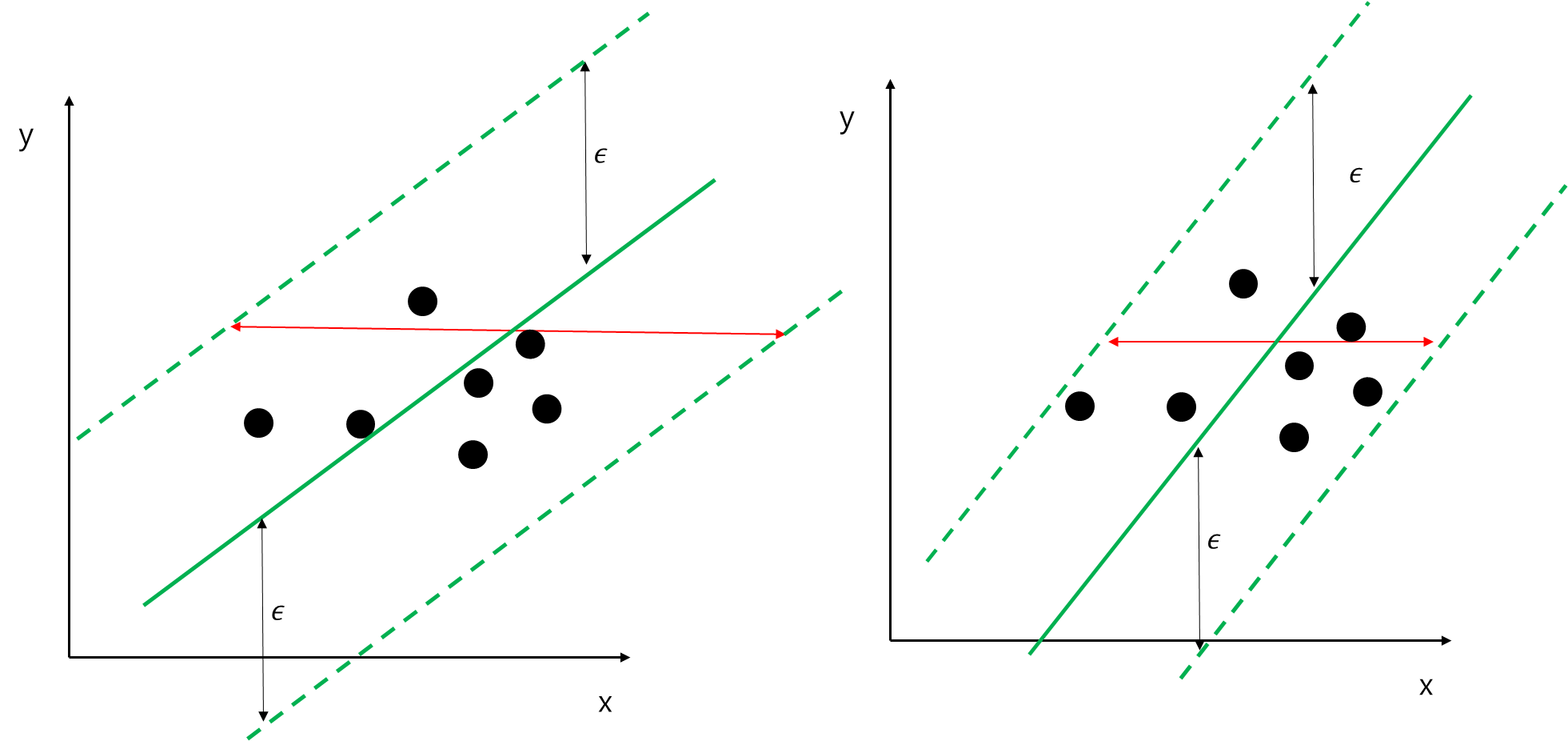 회귀 문제도 분류 문제에서 설명했던 것과 같다. 아래 두 직선은 모두 $\epsilon$ 범위 내에 데이터를 포함하고 있다. 이때 여백(빨간 선)을 보면 왼쪽이 오른쪽보다 더 크다. 분류 문제에서와 마찬가지로 서포트 벡터 머신(Support Vector Machine)은 일반화 관점에서 여백이 큰 왼쪽 직선을 선호하게 된다.