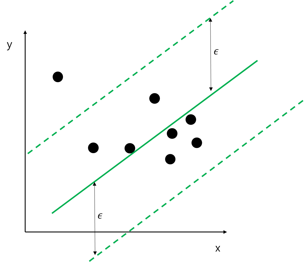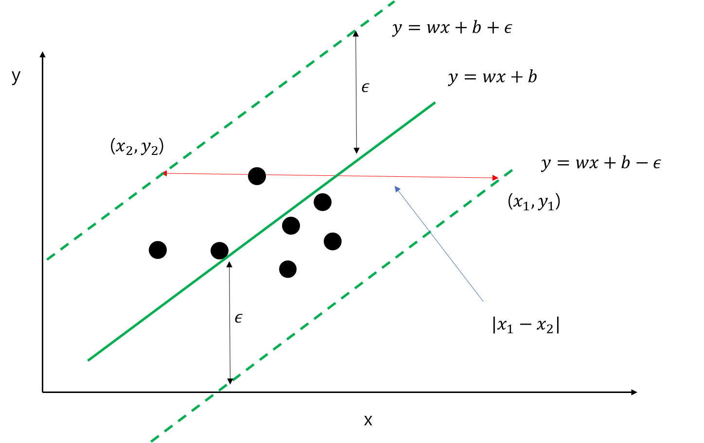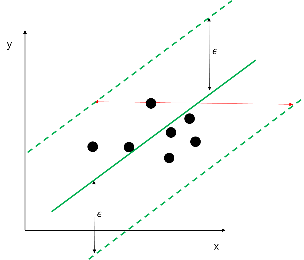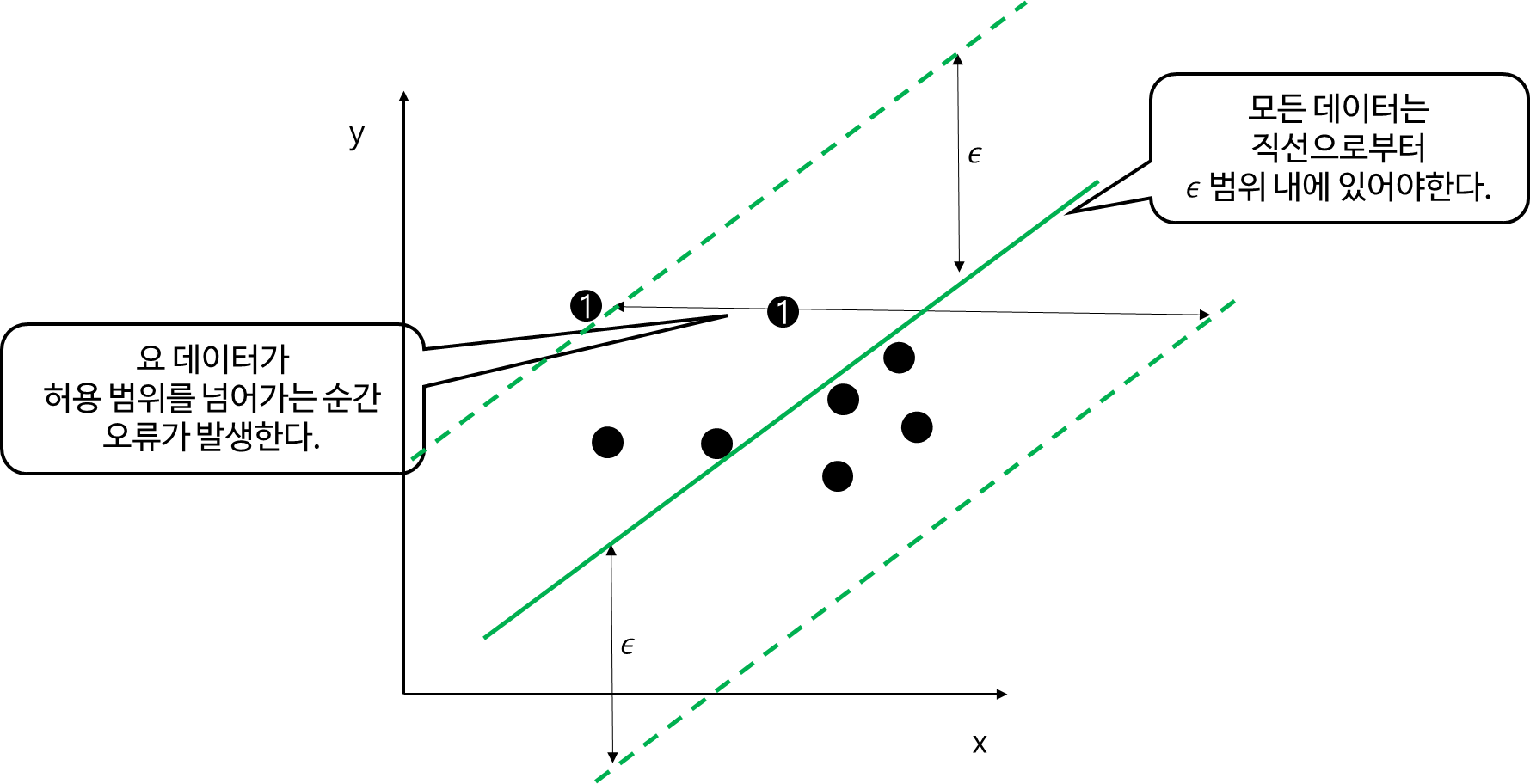 다음으로 회귀 문제에서의 여백(Margin)의 의미를 알아보자. 여기서는 문제를 단순화하기 위하여 단순 선형 모형(설명 변수 1개)을 생각해보겠다. 서포트 벡터 머신(Support Vector Machine)을 회귀 문제에 적용할 때에는 기본적으로 데이터들이 초평면으로 부터 $\epsilon >0$ 범위 내에 있다고 가정한다. 즉, 아래 그림과 같이 데이터들은 초록색 직선으로부터 $\epsilon$ 범위(양쪽 점선 사이)에 있는 상황이다. 이때 입력 데이터는 1차원이므로 $x$축 상에서 왔다 갔다 할 것이다. 여기서는 양 점선 사이의 수평 거리를 생각해보자. 이때 1번 데이터가 이 수평거리를 넘어가게 된다면 $\epsilon$ 범위를 넘어가게 되어 오류를 발생시킨다.