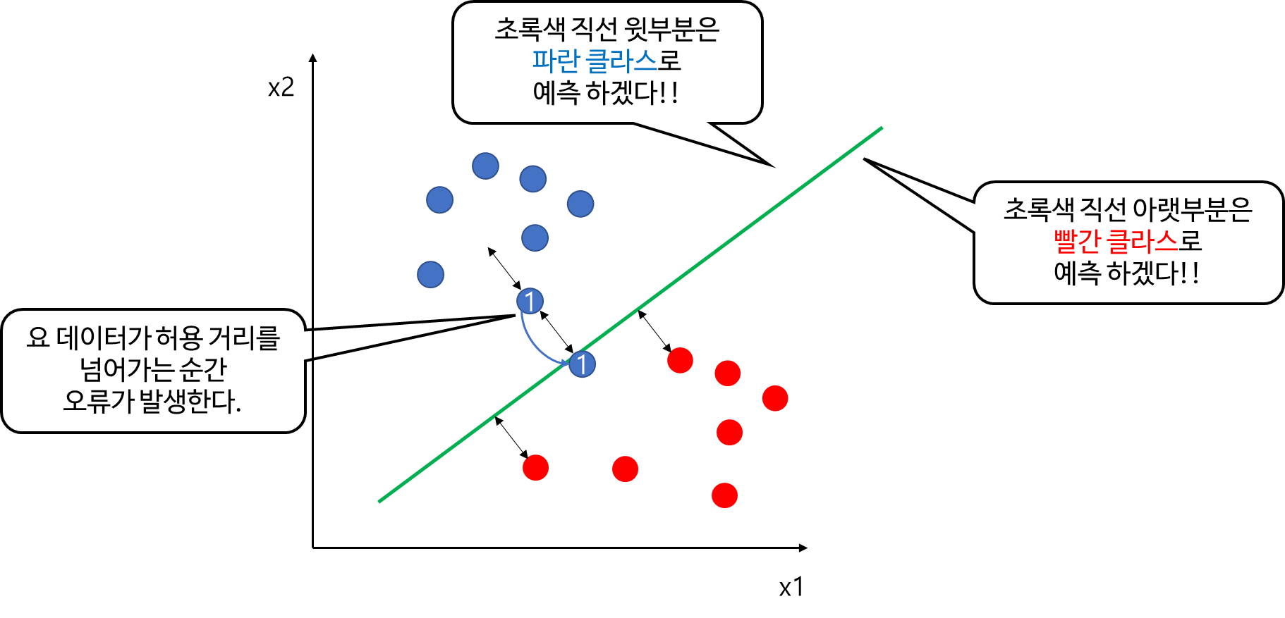 따라서 파란색 1번 데이터와 직선과의 거리가 여백(Margin)이 되는 것이다(이를 넘어가면 오류를 발생시키므로).