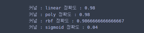 이번엔 여러 가지 커널을 사용하여 서포트 벡터 머신을 적용해보았다. 여기서는 sigmoid는 제외하였다. 랭크 문제가 발생하여 에러가 나서 그렇다 ㅠㅠ