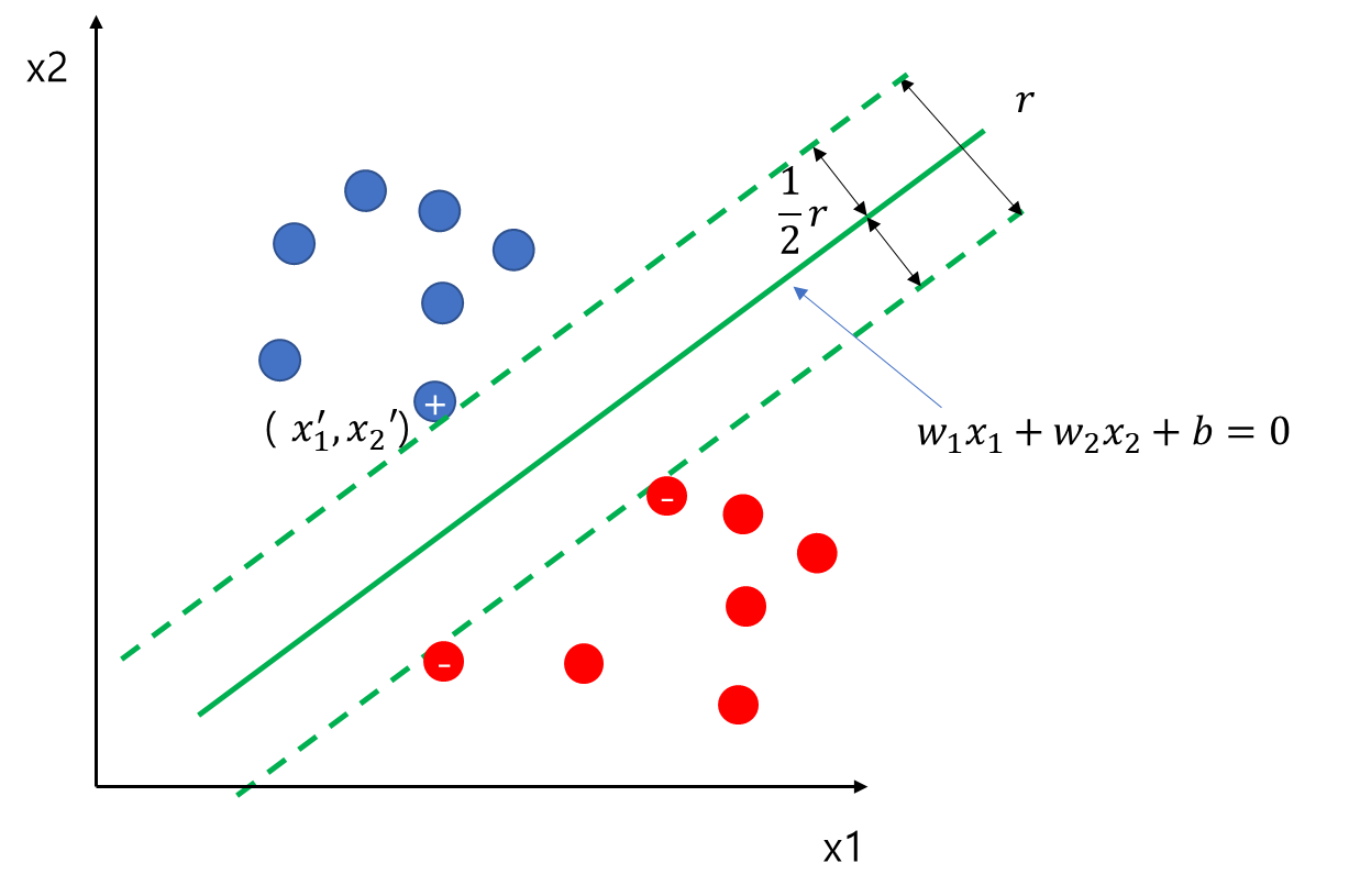 식 (1)에서 우리가 최대화해야 하는 목적함수는 $r$이다. 이를 우리가 찾고자 하는 $w, b$로 나타내 보자. 설명의 편의를 위하여 위 그림의 예시를 이용하여 유도하고자 한다. 이 예시에서 파란색은 1, 빨간색은 -1로 라벨링 되어있다. 먼저 +로 표시된 데이터의 입력 변수 좌표를 $(x_1', x_2')$라 하자.