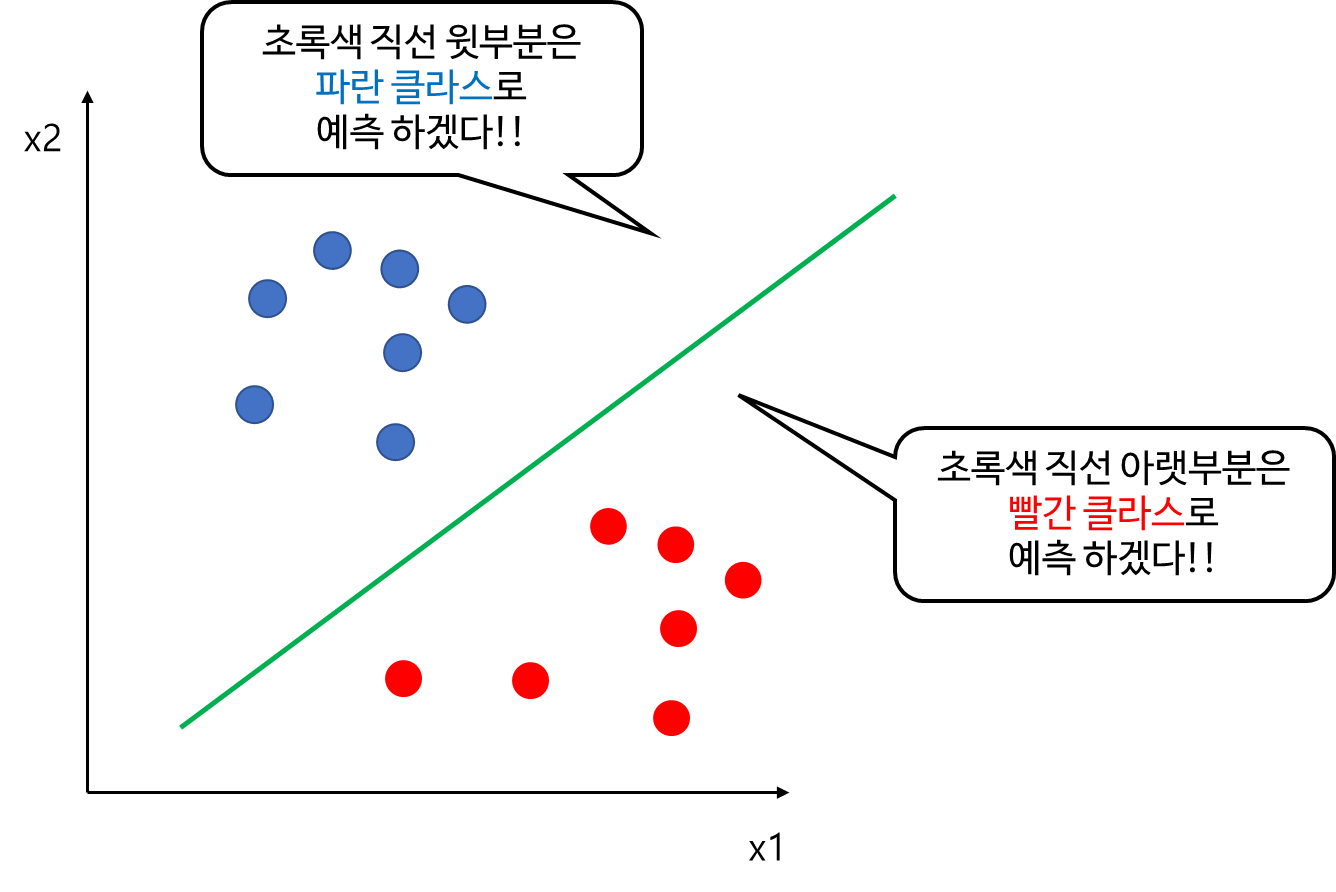 (5)를 풀어서 얻은 $w, b$과 입력 값 $x$이 주어지면 다음과 같이 라벨을 예측한다.