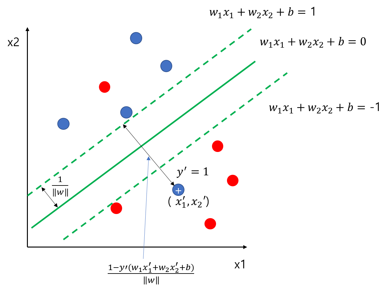 이 된다. 첫 번째 등식은 '+' 데이터가 위쪽 점선 아래에 있으므로 $w_1x_1'+w_2x_2'+b-1<0$을 만족하기 때문에 성립한다. 두 번째 등식은 $y'=1$이므로 성립한다.