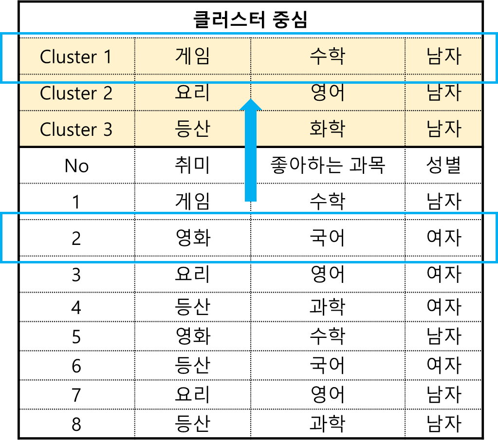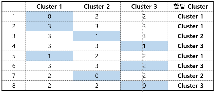 이제 모든 데이터와 모든 클러스터 중심에 대해서 비 유사도를 계산했으면 각 데이터에 클러스터를 할당한다. 이때 비유사도가 가장 적은 클러스터를 할당한다. 다음은 데이터와 클러스터 중심 간 비 유사도를 계산한 것이며 색칠된 칸은 각 데이터에 대하여 비 유사도가 가장 작은 클러스터를 나타낸 것이다. 이때 두 번째 학생의 경우에는 비 유사도가 모두 3이므로 이 중 랜덤하게 Cluster 1을 선택하였다.