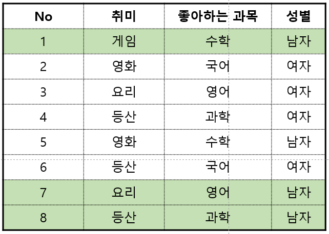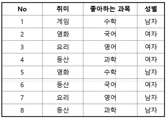 먼저 다음과 같이 8명 학생에 대한 취미, 좋아하는 과목, 성별 데이터가 있다고 하자.