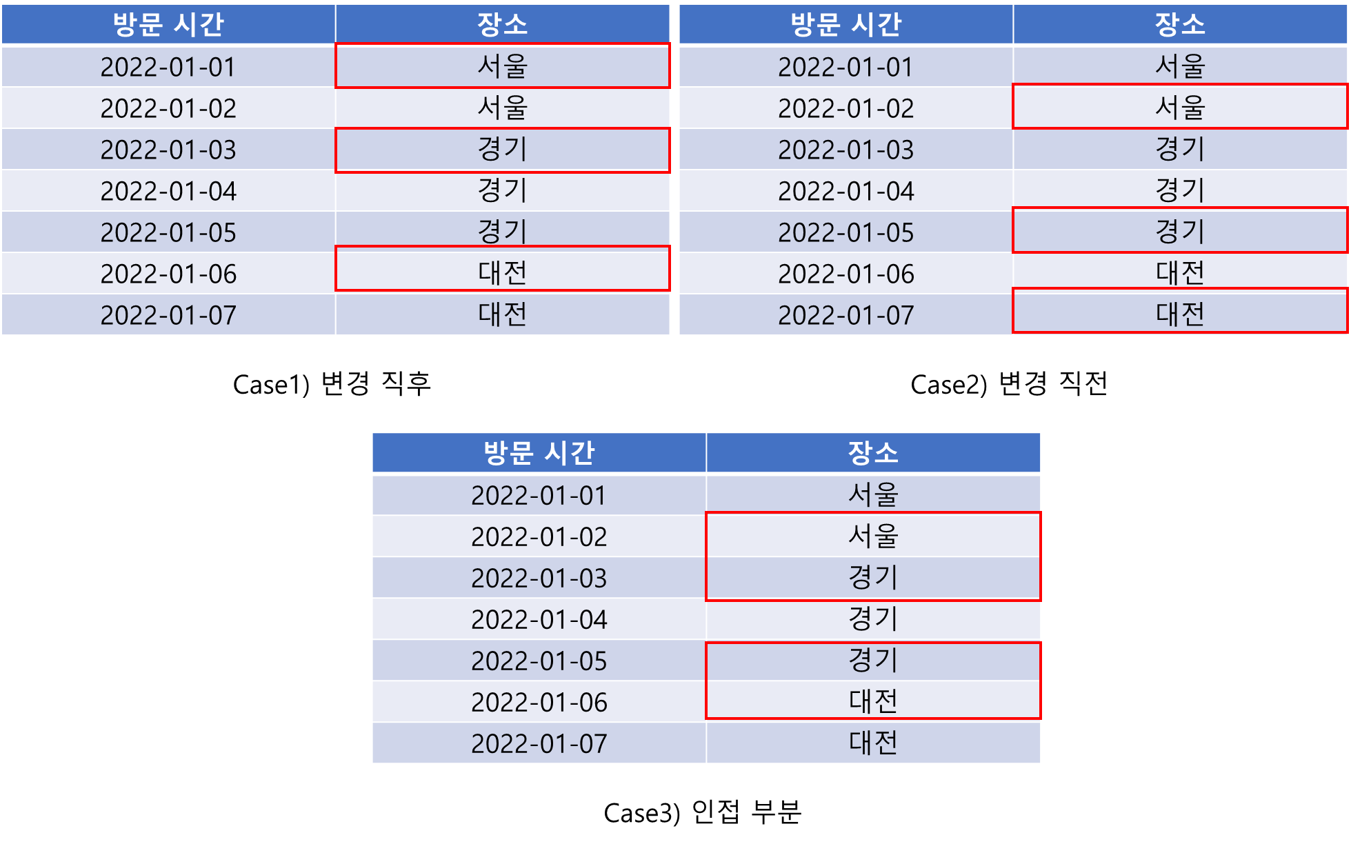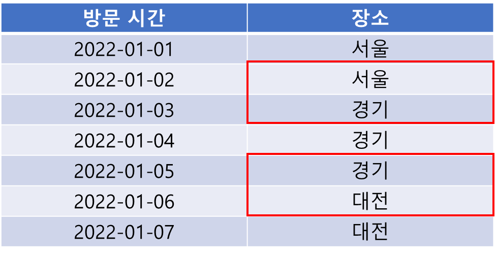 특정 칼럼의 값이 바뀐다는 것은 다음과 같이 (시간 순으로 정렬된) 데이터가 주어졌을 때 특정 칼럼의 값이 이전과는 다른 값이 나타났다는 뜻입니다(빨간 박스).