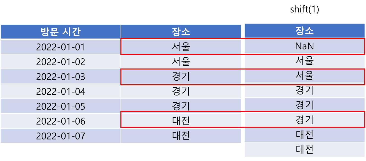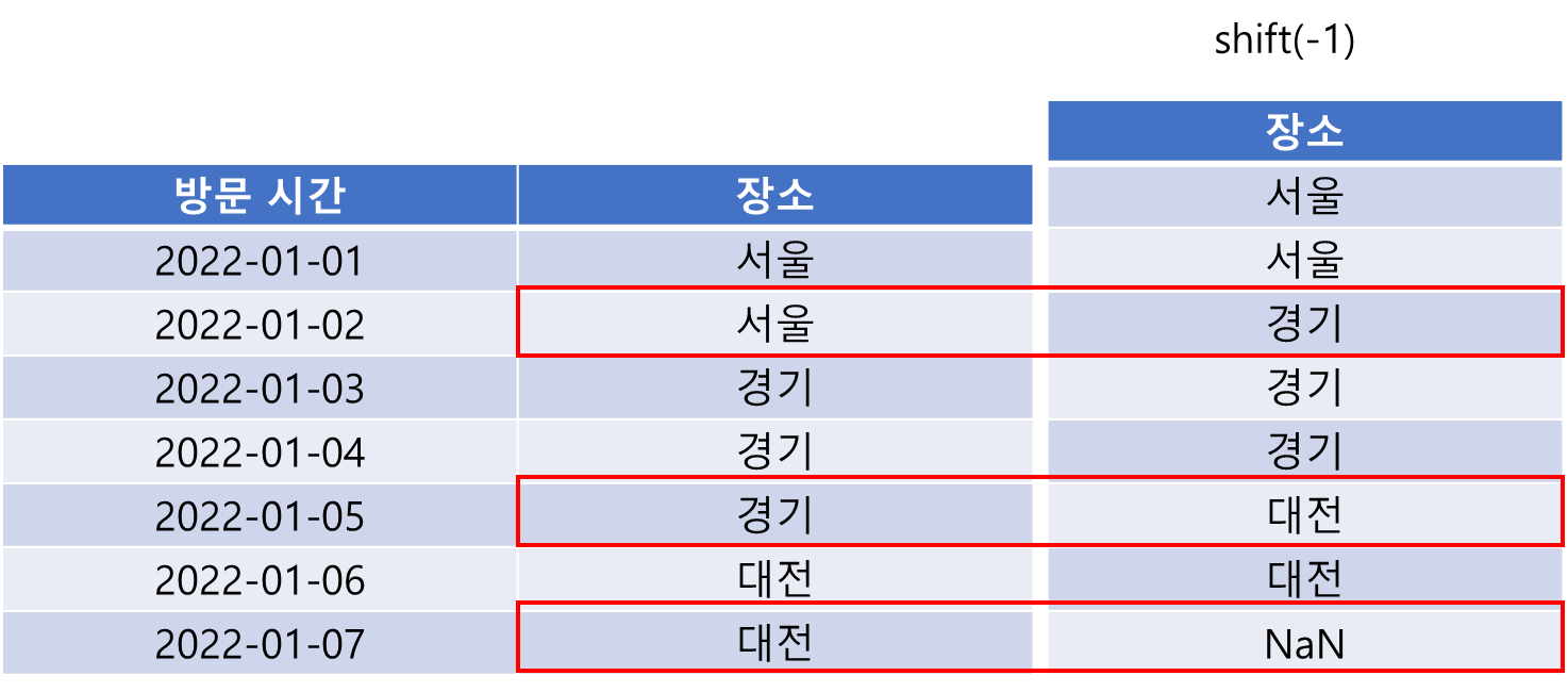이 부분은 shift가 아닌 for 문을 이용하여 구현할 수 있습니다. 데이터의 모든 행을 돌면서 현재 행의 장소와 다음 행의 장소가 다르면 현재 행, 다음 행 인덱스를 저장합니다.
