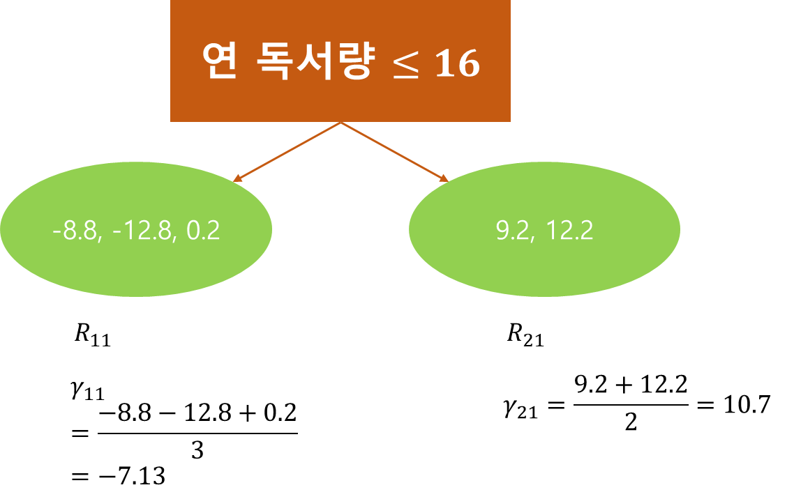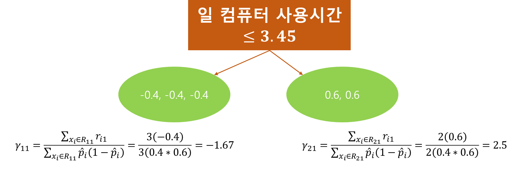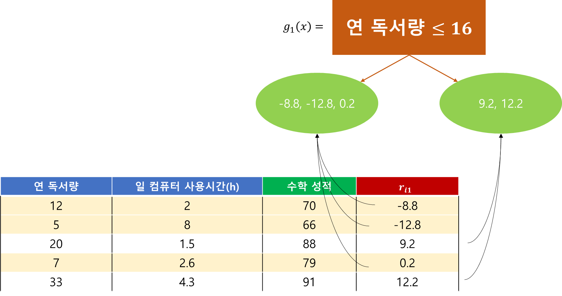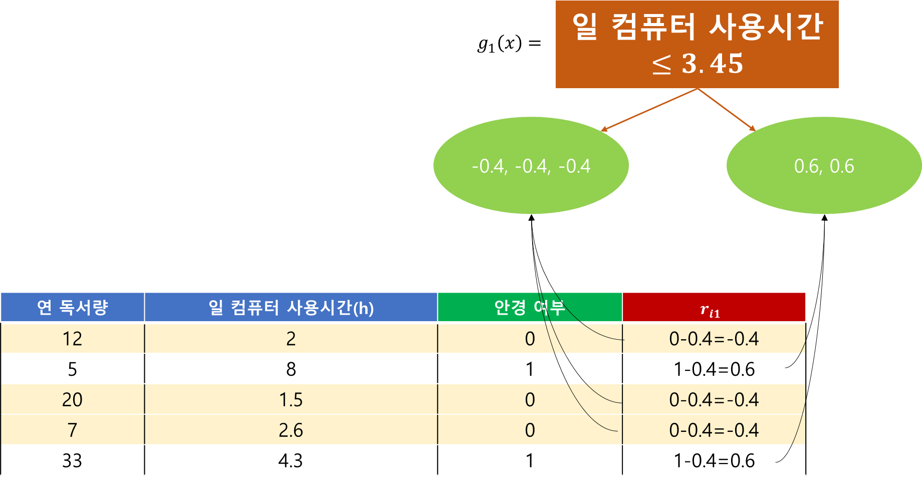 $(x_i, r_{im}), i=1, \ldots, n$을 이용하여 학습한 의사결정나무 $g_m$은 다음과 같다.