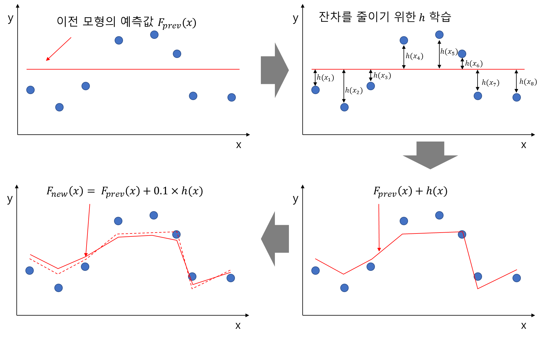 아래에서 이전 모형의 예측값을 빨간 선이라고 해보자(좌측 상단). 그러고 나서 실제값과 예측값의 차이를 줄여주는 $h$를 학습하게 된다.(우측 상단). 이때 새로운 예측값을 $F_{\text{prev}}(x)+h(x)$을 할 수도 있다(우측 하단). 하지만 이 경우 학습 데이터를 과도하게 적합할 수 있기 때문에, 즉 과적합이 발생할 수 있어서 잔차를 많이 줄이는 대신(하지만 이전 모형보다는 잔차는 작아진다) 학습률 $l$을 $h(x)$에 곱한 값을 이전 모형의 예측값에 더하여 새로운 예측값 $F_{\text{new}}(x) = F_{\text{prev}}(x)+l h(x)$를 얻게 된다(좌측 하단 그림).