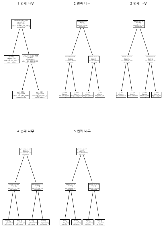 만약 base_estimator가 의사결정나무이고 반복수(또는 분류기 개수)가 적다면(5개 이하) 의사결정나무를 순차적으로 그려볼 수 있다.