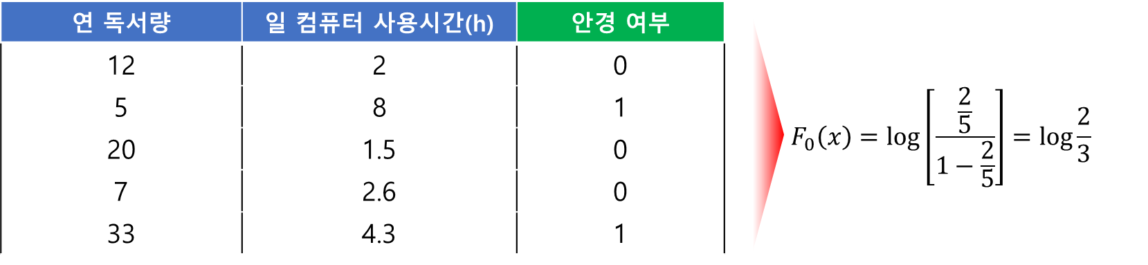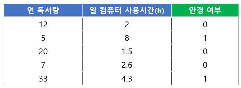 연간 독서량, 하루 컴퓨터 사용시간을 이용하여 안경 착용 여부를 예측한다고 해보자. 안경 여부 칼럼에서 1은 안경 착용, 0은 미착용이다.
