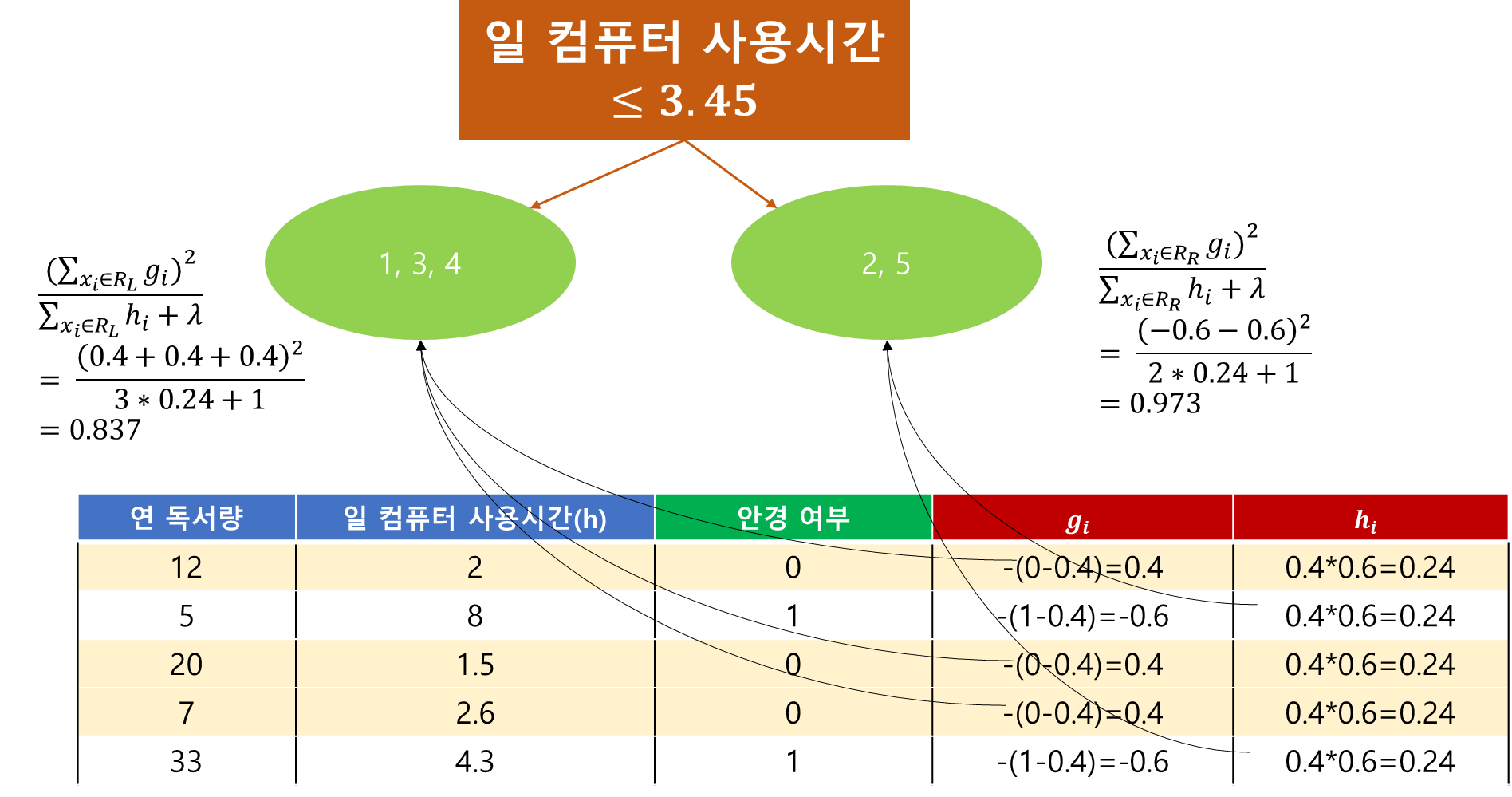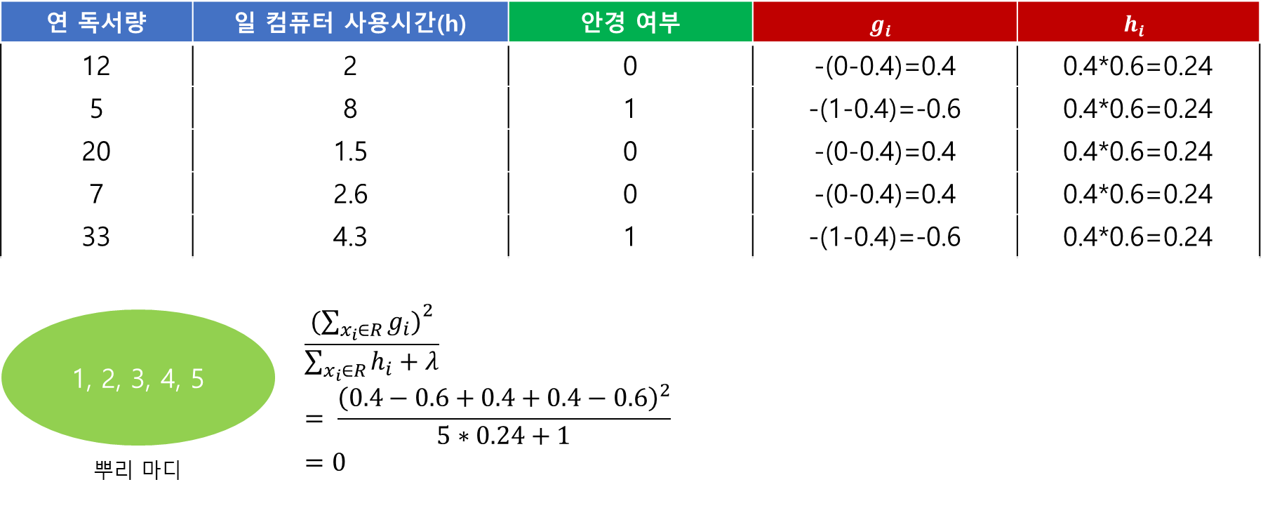 예제에서는 $\lambda=1$로 설정했으나 이를 더 큰 값으로 한다면 Similarity Score는 작아진다. 따라서 자식 마디의 Similarity Score 합이 부모 마디의 그것보다 오히려 더 작아질 수 있어 이때에는 분리가 일어나지 않을 수 있는 것이다. 따라서 $\lambda$는 필요 이상의 가지를 치지 않도록 막아주는 역할을 한다고 할 수 있으며 이는 곧 과적합을 막아준다는 것을 의미한다.