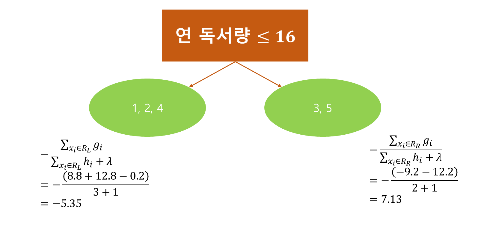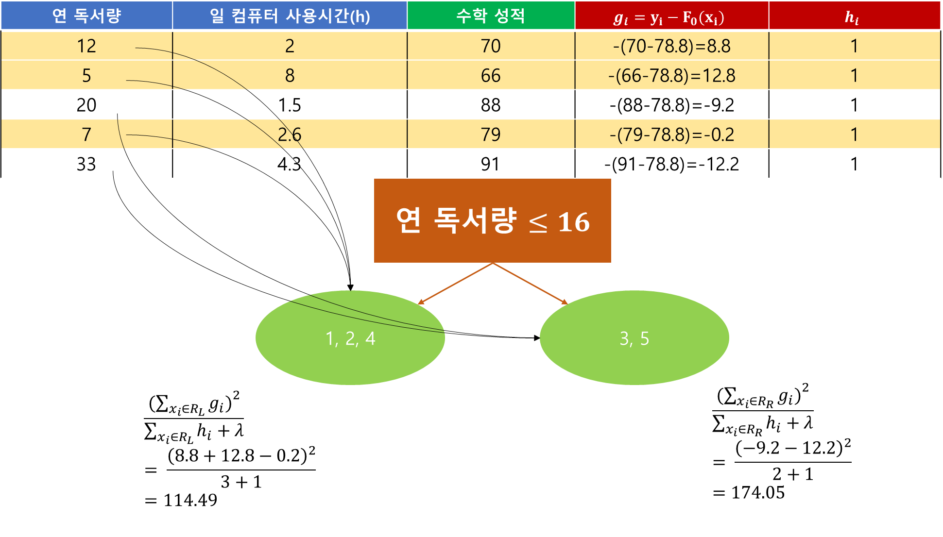 $$\begin{align} & \frac{1}{2} \left [ \frac{\left ( \sum_{x_i\in R_L }g_i \right )^2 }{\sum_{x_i \in R_L}h_i+\lambda } +\frac{\left ( \sum_{x_i\in R_R }g_i \right )^2 }{\sum_{x_i \in R_R}h_i+\lambda } - \frac{\left ( \sum_{x_i\in R}g_i \right )^2 }{\sum_{x_i \in R}h_i+\lambda } \right ]-\gamma \\ &= \frac{1}{2}\left [ 114.49+174.05-0 \right ] - 0 \\ &= 144.27 \end{align}$$