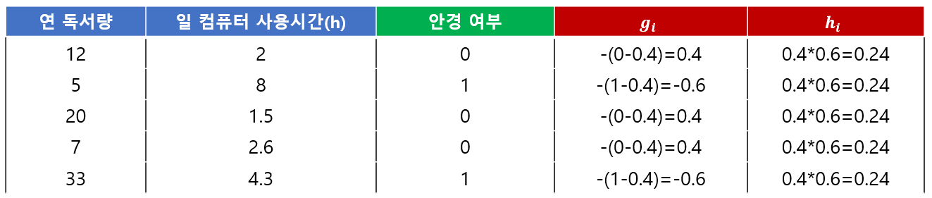 미분을 이용하면 $g_i, h_i$는 다음과 같음을 알 수 있다.