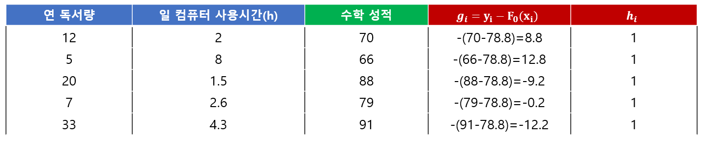 $$g_i = -(y_i-F_{m-1}(x_i)) = -(y_i-F_0(x_i)), \;\; h_i = 1 $$
