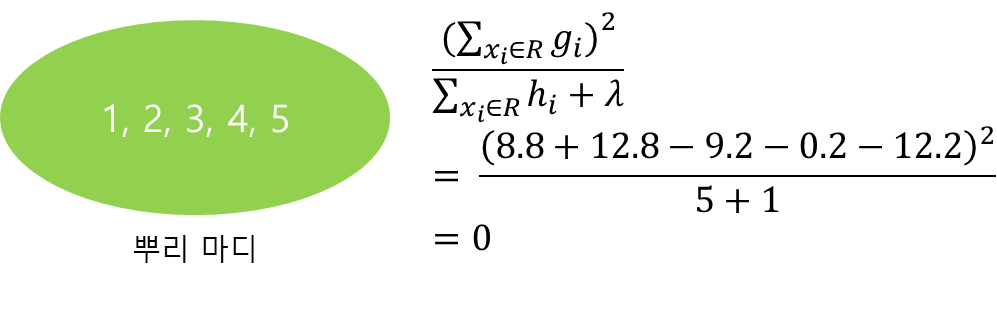 $$\frac{\left ( \sum_{x_i\in R}g_i \right )^2 }{\sum_{x_i \in R}h_i+\lambda }$$