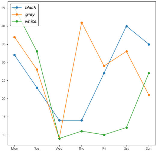 black, grey, white 순으로 범례 라벨을 표시해야 하므로 이 순서대로 선 그래프를 출력합니다.
