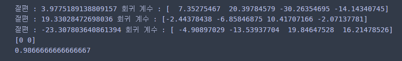 print('절편 :', clf.intercept_[i] ,'회귀 계수 :', clf.coef_[i])