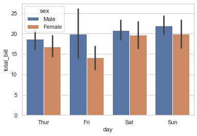 hue를 사용하면 그룹 막대 그래프를 그릴 수 있습니다. 아래 코드는 일별 평균 total_bill을 성별로 한번 더 세분화한 그룹 막대 그래프를 그리는 코드입니다.