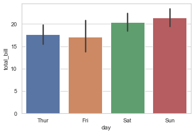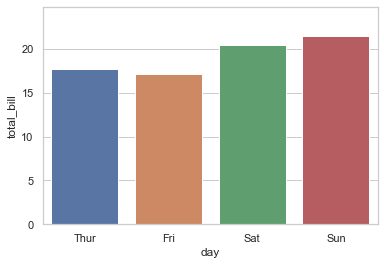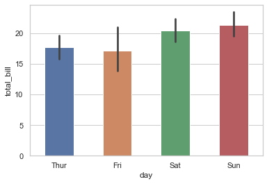 꽁냥이는 요일별 평균 total_bill 값을 막대 그래프로 그릴 거예요. data인자에 Tip 데이터를 담고 있는 데이터프레임을 넣어주고요. x축엔 요일을 나타내는 칼럼 이름 'day', 그리고 y엔 'total_bill'을 넣어줍니다.