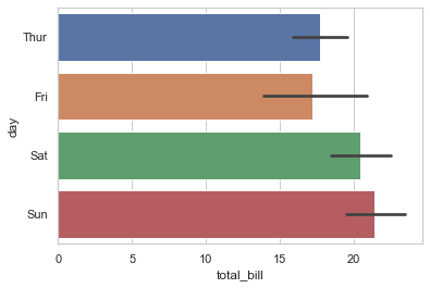 sns.barplot(x="total_bill", y="day", data=tip_df, orient='h')