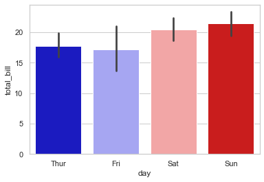 sns.barplot(x="day", y="total_bill", data=tip_df, palette=cm)