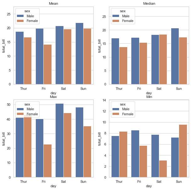 barplot은 기본적으로 각 범주에 대응하는 수치형 데이터가 2개 이상이라면 평균을 막대 그래프로 그려줍니다. 이때 평균 말고 다른 통계값을 쓰고 싶을 때에는 estimator 인자에 통계값을 계산하는 함수를 넣어주면 됩니다. 아래는 평균, 중앙값, 최대값, 최소값을 적용하여 막대 그래프를 그리는 코드입니다.