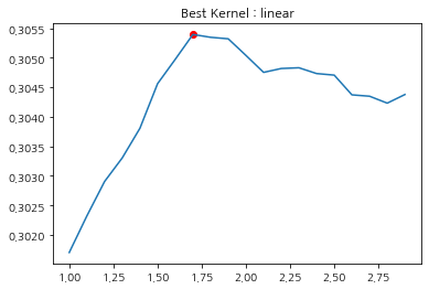 ## 최적 커널에 대하여 C에 대한 교차 검증 스코어 값 시각화