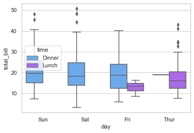 추가적인 범주형 변수를 이용하여 더 세분화된 박스 플롯을 그리고 싶다면 hue를 이용하면 됩니다. hue 인자에 범주형 칼럼명을 넣어주면 해당 범주에 대한 세분화된 박스 플롯을 그릴 수 있어요. 이때 hue_order를 이용하면 범주의 색상 적용 순서를 바꿀 수 있어요.