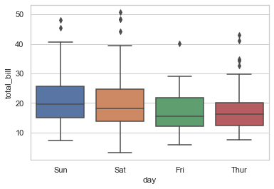 여기에 x인자를 추가하면 여러 개 박스 플롯을 그릴 수 있습니다. 꽁냥이는 요일별 total_bill 박스 플롯을 그려보았어요. 이때 order 인자를 사용하여 요일 순서를 정해서 박스 플롯을 그릴 수 있어요.