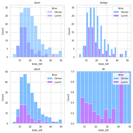 또한 범주별로 여러 개 히스토그램을 그릴 때 multiple 인자를 이용하여 여러 히스토그램을 그리는 방식을 고를 수 있습니다. 아래 코드를 실행하여 multiple 인자에 들어가는 값에 따라 어떻게 그려지는지 살펴보세요.