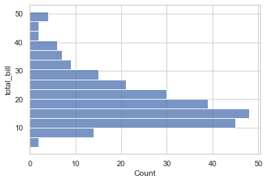 # ax = sns.histplot(y=tip_df['total_bill']) ## 수평 히스토그램