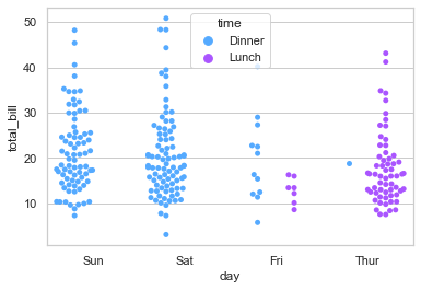 Seaborn은 여기에서 그치지 않고 추가 범주형 변수를 이용하여 더 세분화된 Swarm Plot을 그릴 수 있는 인자가 있는데 바로 hue입니다. hue 인자에 범주형 칼럼명(데이터프레임 속 칼럼 이어야 함)을 넣어주면 해당 범주에 대한 세분화된 Swarm Plot을 그릴 수 있습니다. 이때 hue_order를 이용하면 범주의 색상 적용 순서를 원하는대로 바꿀 수 있어요. 그리고dodge을 True로 하면 hue에서 지정한 칼럼을 대상으로 점들을 한 곳에 모아 Swarm Plot을 그려주고 False인 경우 분리해서 Swarm Plot을 그려줍니다.