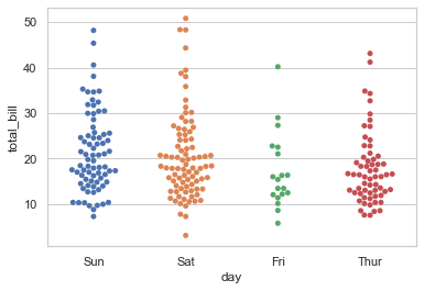 ax = sns.swarmplot(data=tip_df, x='day', y='total_bill',