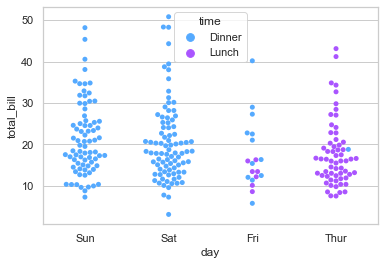 여기에 x인자를 추가하면 여러 개 Swarm Plot을 그릴 수 있습니다. 아래 코드는 일별 total_bill에 대한 Swarm Plot을 그린 것입니다. 이때 Order 인자를 사용하여 요일 순서를 바꿀 수 있습니다.