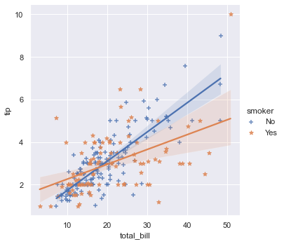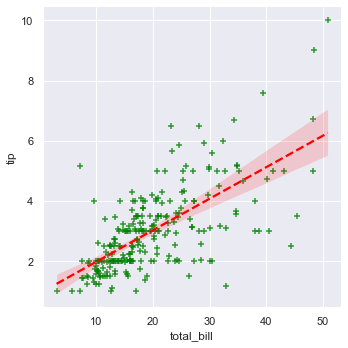 이외에도 markers 인자를 통해 마커 모양을 변경할 수 있고 line_kws, scatter_kws를 통해 라인 스타일과 산점도 색상을 바꿀 수 있어요. 아래 코드를 통해 그 사용법을 확인해보세요.