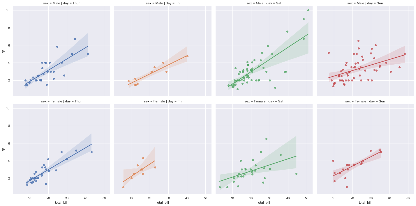 col 인자와 함께 row 인자를 설정하면 2 범주 산점도를 그릴 수 있습니다. 이때 그래프는 (col 범주 수) X (row 범주 수) 만큼 그려집니다.