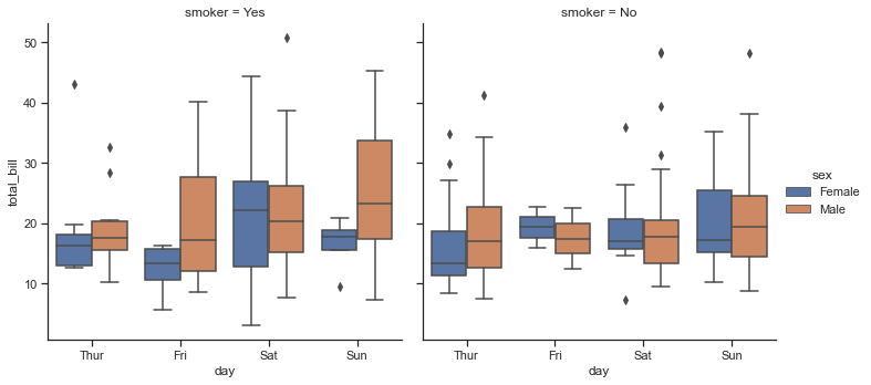 그래프 종류는 디폴트로 Strip Plot입니다. 그래프 종류를 바꾸고 싶다면 kind 인자를 쓰면 됩니다. 꽁냥이는 박스 플롯으로 바꾸었어요. kind 인자에 들어갈 수 있는 것들이 무엇인지 궁금하신 분들은 여기를 참고하시면 됩니다.