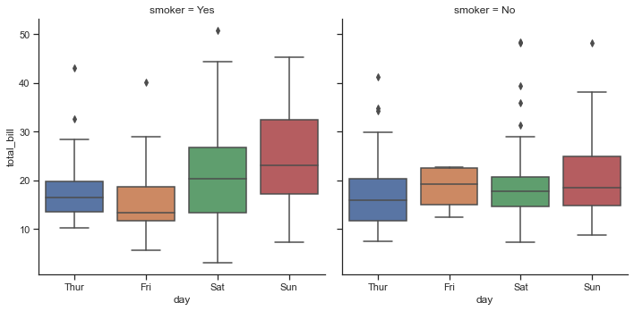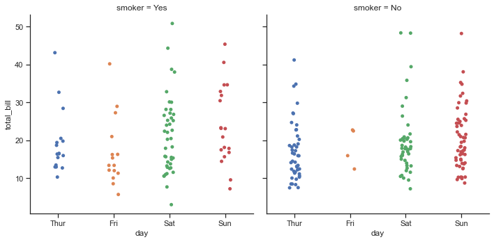 catplot은 data인자에 데이터프레임 구조를 갖는 데이터를 넣어주고, x, y인자에 칼럼명을 설정합니다(catplot이므로 둘 중하나는 범주형 변수 타입이어야되지요). 그리고 col 인자에 범주형 칼럼명을 지정하여 해당 칼럼 범주 수만큼 그래프를 분할하여 그려주게 됩니다.