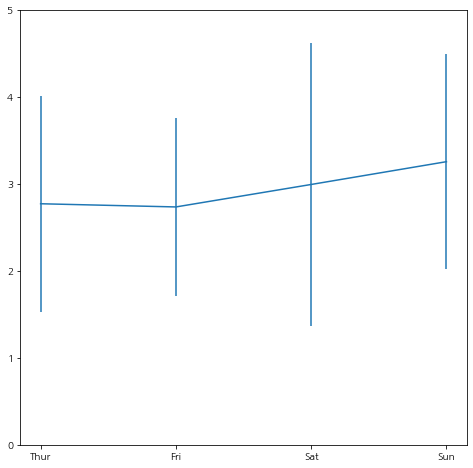 꽁냥이는 일별 평균 팁과 표준편차를 계산했어요. 표준편차는 Error Bar를 그리기 위해 계산한 거예요.