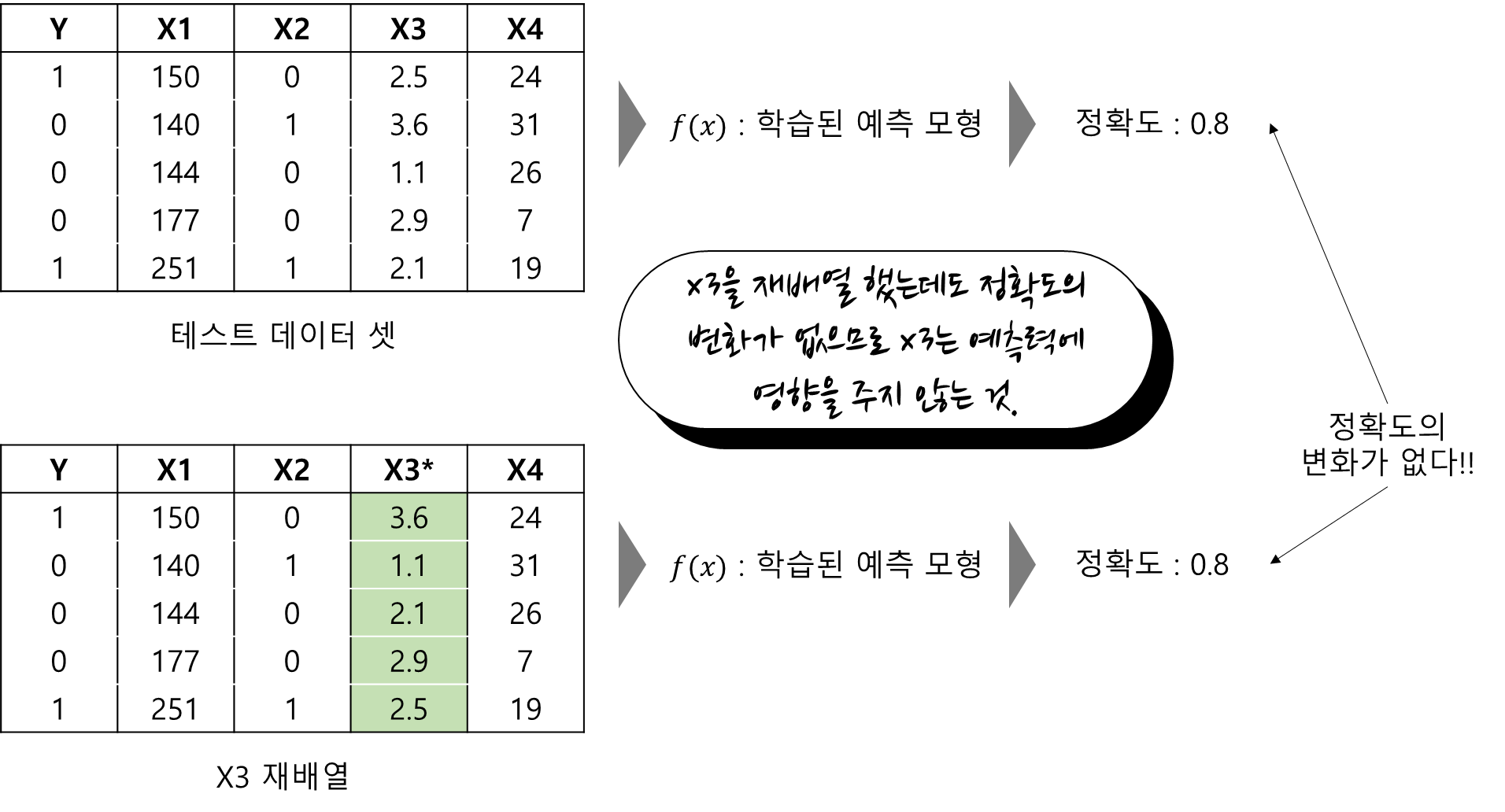 반대로 특정 변수를 재배열했을 때의 예측력이 기존 예측력과 비교하여 매우 달라졌다면 해당 변수는 예측력에 영향을 크게 작용한 것으로 생각할 수 있는 것이다.