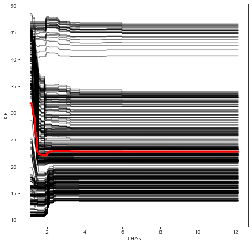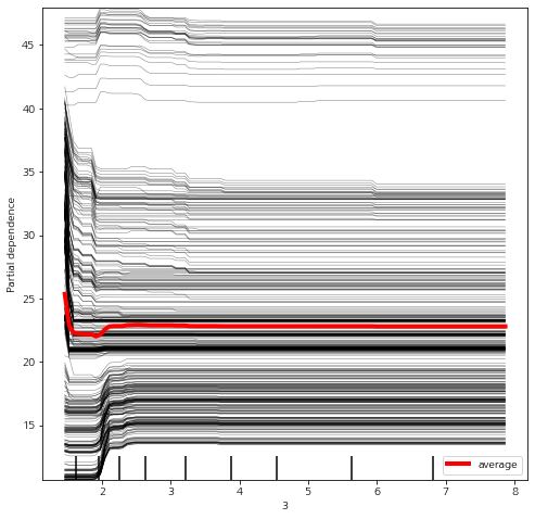 Individual Conditional Expectation Plot(ICE, 개별 조건부 평균 그림)은 특정 변수에 대한 의존도를 개별 예측치로 시각화한 것이다.