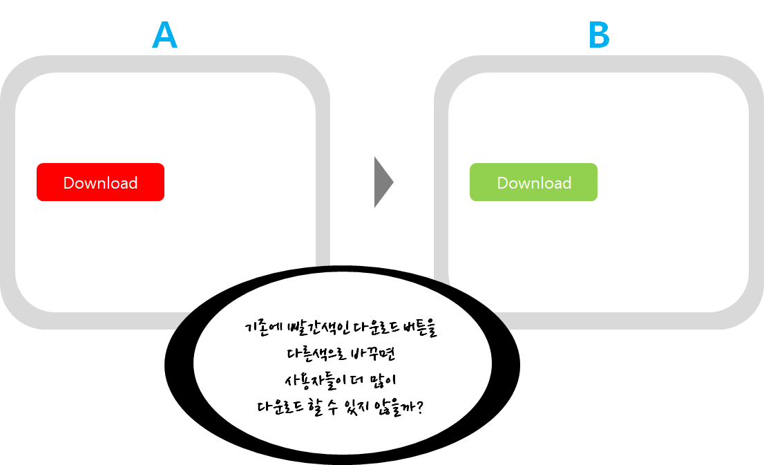 예를 들어볼까요? 만약 어떤 홈페이지 운영자가 버튼의 색깔을 바꿔서 다운로드 횟수를 올리고 싶다고 해볼게요.