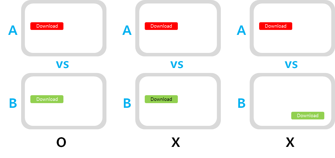 만약 검증할 요소가 초록색 버튼이라면 버튼 색상 외 다른 요소들은 기존 환경과 실험 환경이 동일해야 합니다. 그 이유는 검증하고자 하는 결과(여기서는 다운로드 횟수 증가)와 바뀐 부분(버튼 색상)의 연관성을 정확하게 파악하기 위해서입니다.