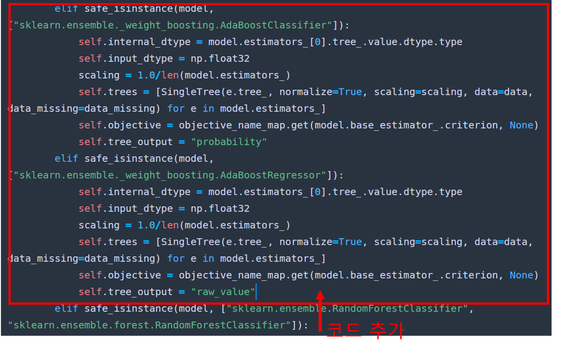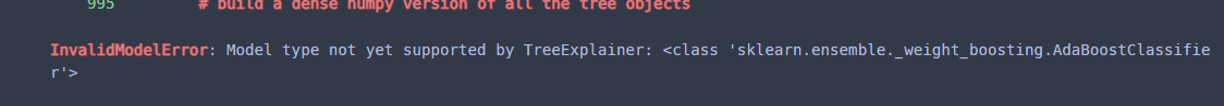 Scikit-Learn에서 AdaBoostClassifier, AdaBoostRegressor 클래스 사용 시 기본 학습기를 트리 모형으로 적용한 경우에 shap.TreeExplainer 사용을 생각해볼 수 있다. 하지만 당연히 될 줄 알았는데 아래와 같은 오류가 났었다.