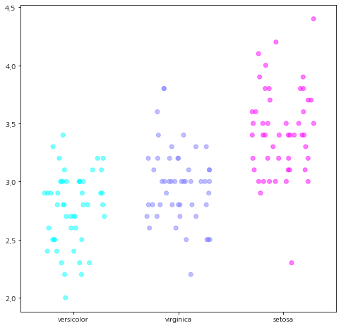 이제 앞에서 사용한 붓꽃 데이터를 이용하여 정렬된 Strip Plot(Jitter Plot)을 그려봅시다.