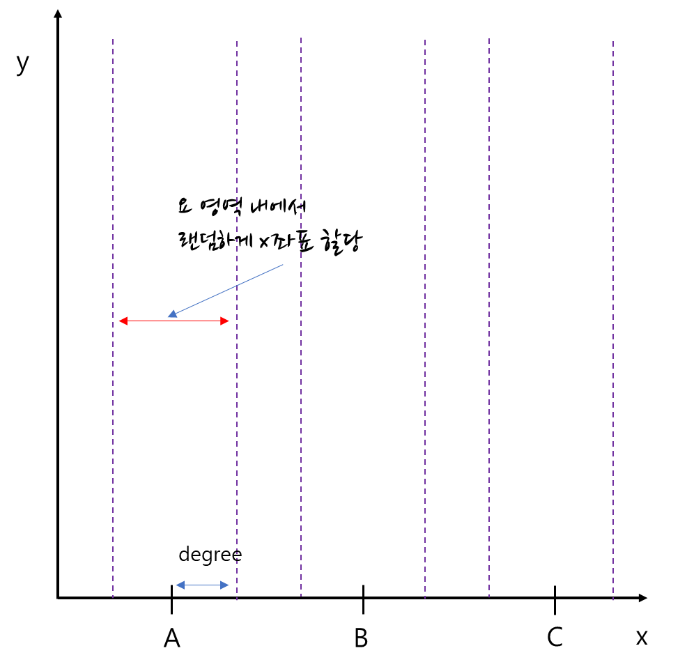 먼저 랜덤 Strip Plot은 y좌표는 그대로 가져오고 각 x좌표 중심으로 데이터의 x좌표를 랜덤하게 할당하는 방법입니다. 아래 그림을 통해 구체적으로 설명하자면 degree라는 것을 설정하여 x좌표 양옆으로 영역(보라색 점선 사이)을 만들어줍니다. 이때 다른 범주 영역에 침범하지 않도록 degree를 정해줘야 하고요. 영역이 만들어졌다면 해당 영역 사이에서 x좌표를 할당하는 것입니다.