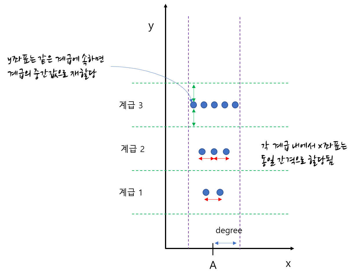 정렬된 Strip Plot(Jitter Plot)은 y좌표를 히스토그램 계급으로 나누어 각 계급의 중앙점을 새로운 y좌표로 할당하고 각 계급 내에서 x축에 평행하게 그린 것을 말합니다. 이때 x 좌표는 각 계급에 포함된 데이터의 개수에 따라 균등하게 할당됩니다.