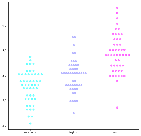 구현을 했으니 실제로 그려봐야겠죠? 먼저 Jitter Plot(Strip Plot)을 그릴 데이터를 준비합니다. 꽁냥이는 붓꽃 데이터를 사용했어요.