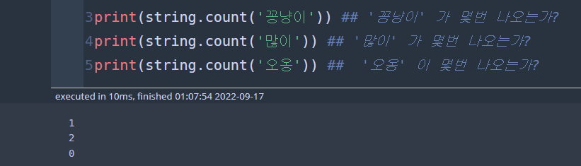 print(string.count('꽁냥이')) ## '꽁냥이' 가 몇번 나오는가?
